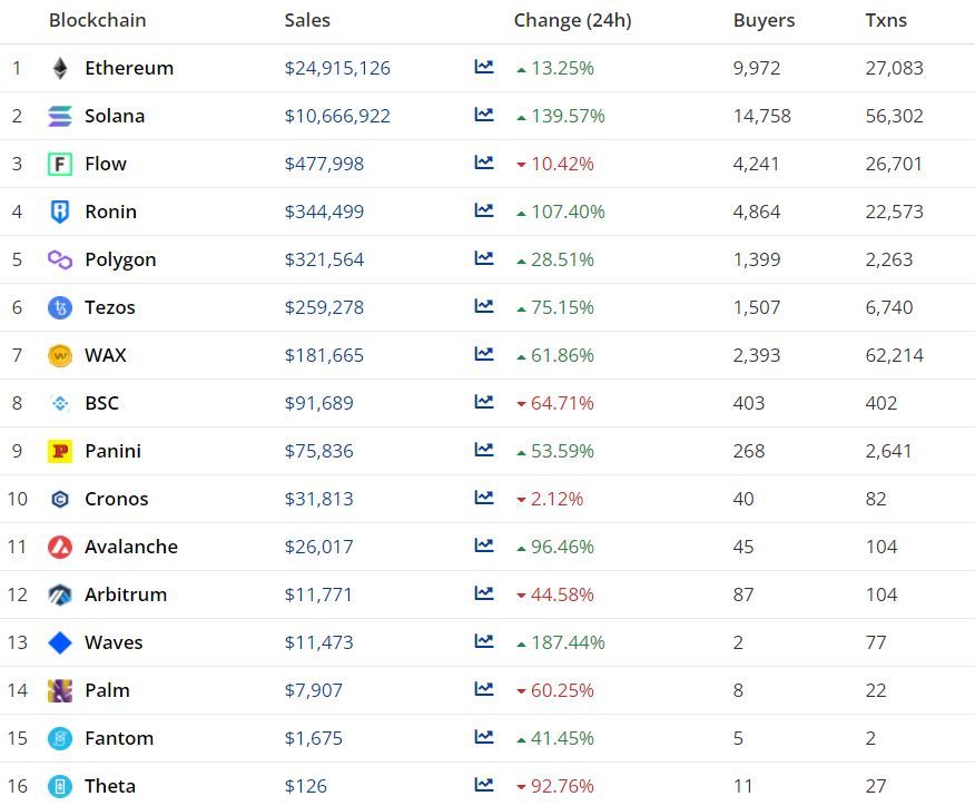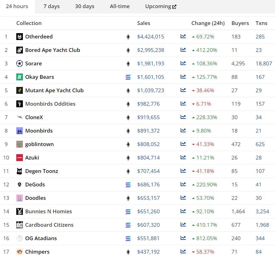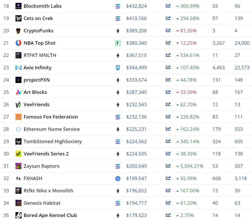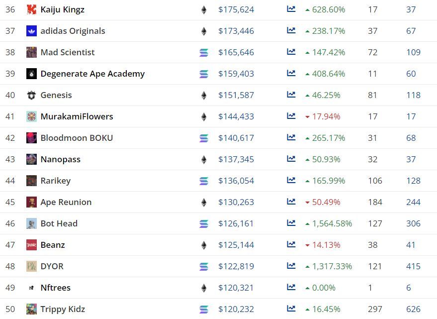 1.NFT市场最近24小时销售额排名前50名的项目: