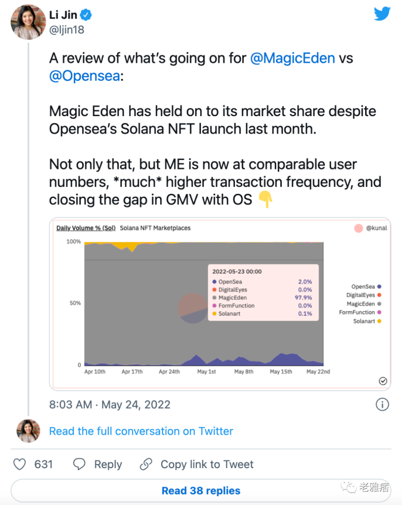 另外,领先的Solana NFT市场Magic Eden在每周用户和交易方面已经超过了以太坊市场OpenSea。然而,值得注意的是,Solana的交易费用只是以太坊的一小部分,这使得它在做诸如上架NFT,以及竞标项目时更加实惠。