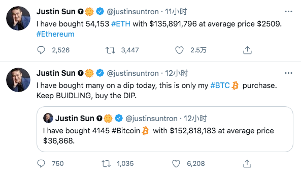 孙宇晨抄底了?耗资近3亿美元买比特币以太坊,已赚近2000万美元