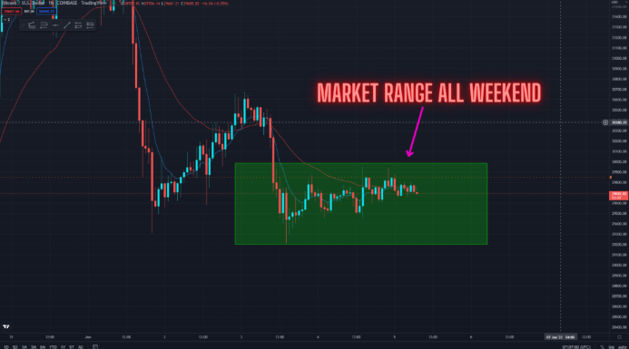 整个周末,我们都看到了比特币的价格区间,并在 1 小时的时间内横盘整理。