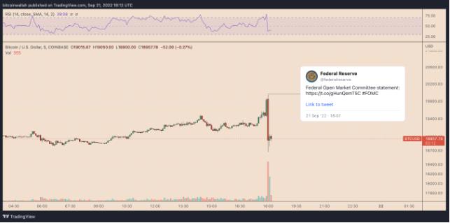 在联邦公开市场委员会发表声明后,BTC 的价格从盘中高点 19,950 美元下跌了约 6.5%,达到18,660 美元。它的下跌反映了美国股市的类似突然修正,基准标准普尔 500 指数在美联储更新后几分钟下跌 0.5%。