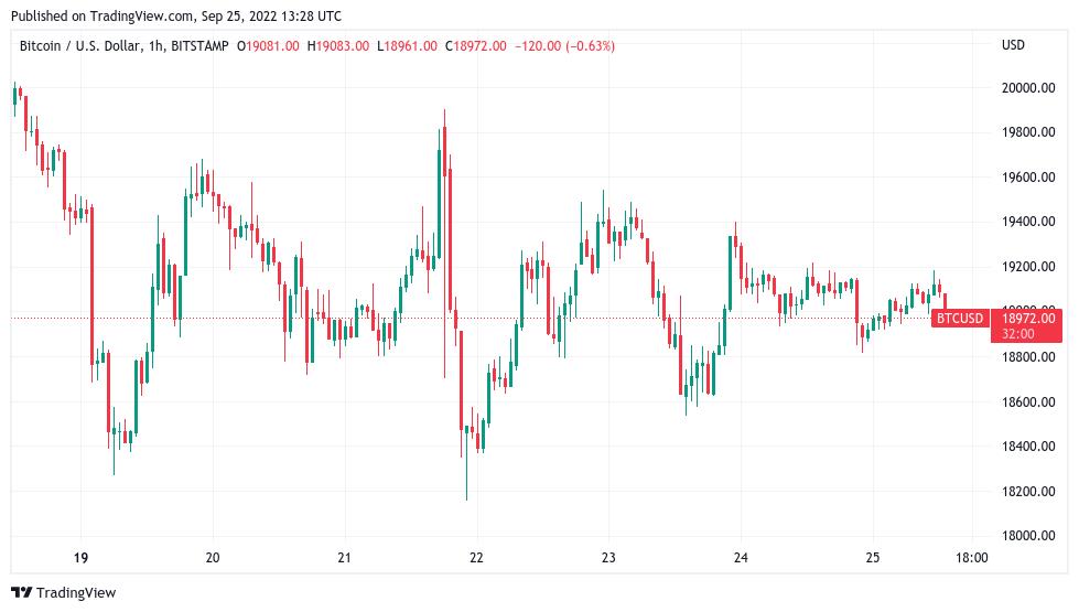 Cointelegraph Markets Pro和TradingView的数据显示,BTC/USD 的交易价格接近 19,000 美元,每周蜡烛还剩几个小时。