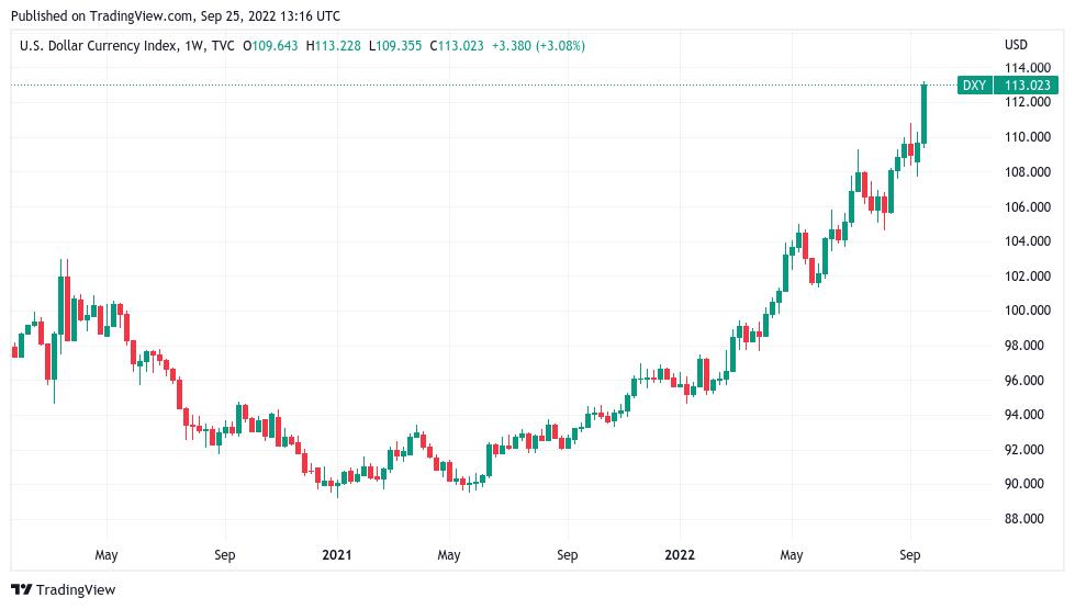 美元指数 (DXY) 1 周蜡烛图。资料来源:TradingView