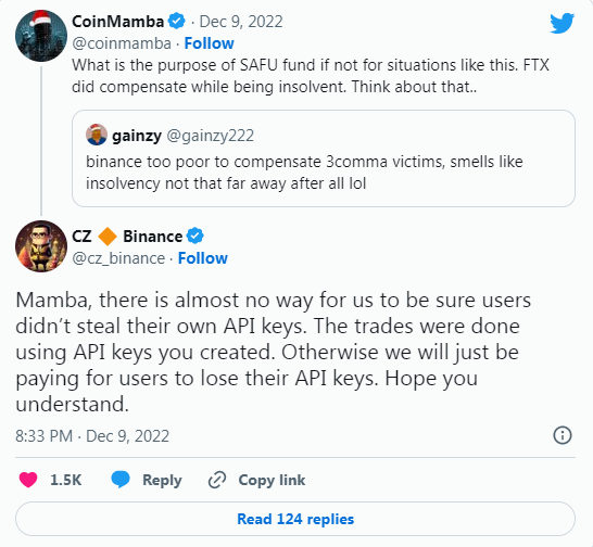 CZ 的披露是在 12 月 9 日发生的一起事件之后发生的,当时 Binance取消了一天前抱怨资金损失的用户的账户。该用户声称,与 3Commas 相关的泄露的 API 密钥被用于“对低价硬币进行交易,以推高价格以获利。” 币安拒绝向用户报销。CZ 在推特上表示,损失无法核实,如果该公司弥补此类损失,“我们只会为用户丢失 API 密钥而付出代价。”