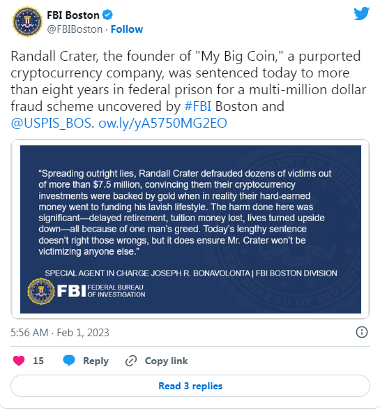 “My Big Coin”的创始人 Randall Crater 被判入狱 100 个月,并被勒令向其欺诈计划的受害者支付超过 760 万美元。