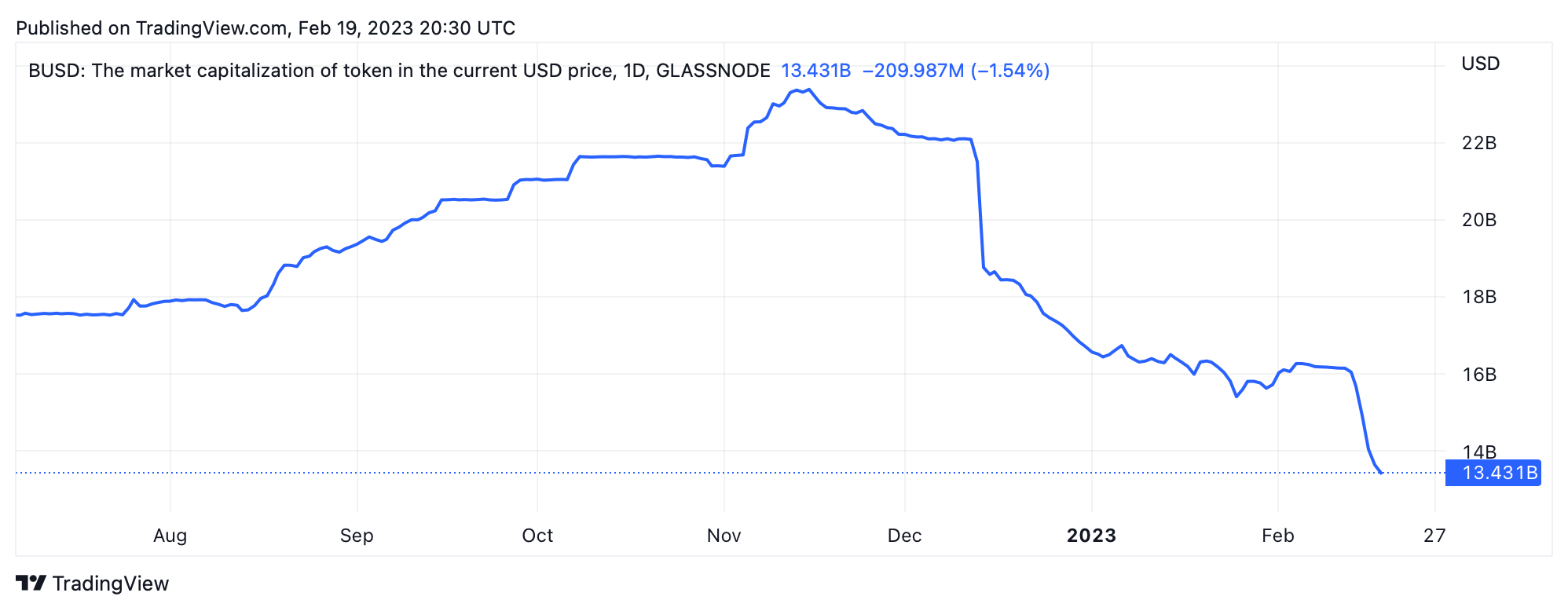 统计数据显示,在过去六天里,大量 BUSD 被赎回,供应量在此期间下降了 17.77%。过去 30 天,BUSD 的供应量缩水了19.2%。2023 年 2 月 13 日,发行、管理和赎回 BUSD 的公司 Paxos宣布,今后将不再铸造新的 BUSD。
