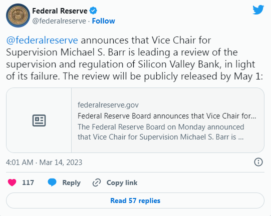 在 3 月 13 日的公告中,美联储概述了监管副主席迈克尔巴尔“鉴于硅谷银行的失败,正在领导对硅谷银行的监管和监管进行审查”,并将于 5 月公开发布审查结果。