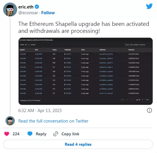 Shapella 硬分叉已在以太坊主网上正式执行——这意味着以太坊验证者最终可以提取他们抵押的以太币来自信标链。