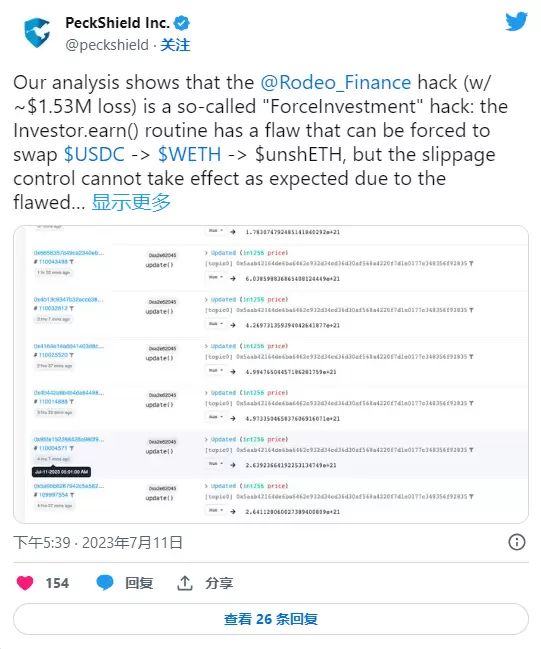 “发生这次攻击是因为我们的一个预言机本来是要为 Camelot 的 Uniswap v2 池进行 twap 的,它被夹在其价格更新周围(Arbitrum 上的第一个),以抬高其价格。这使得黑客可以从贷款池中借款并将其全部兑换为所述代币,从而导致严重滑点,但由于预言机定价过高,仍然会发生这种情况。”Rodeo Finance 在一条推文中表示。