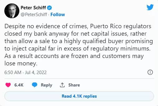 因税收原因搬迁到波多黎各的著名居民包括黄金迷彼得·希夫(Peter Schiff)和加密货币投资者迈克尔·特平 (Michael Terpin)。7 月 4 日,波多黎各监管机构因未达到最低净资本要求而关闭了希夫的银行。