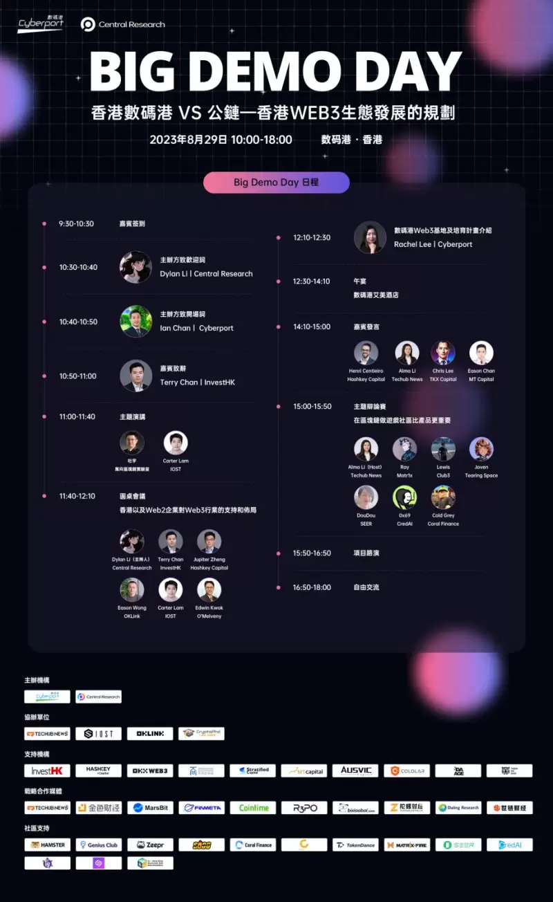 本次Big Demo Day将于8月29日举办第六期,是由香港数码港与Central Research联合举办,Techub News、IOST、OKLink、CryptoPhd协办的大型线下活动。