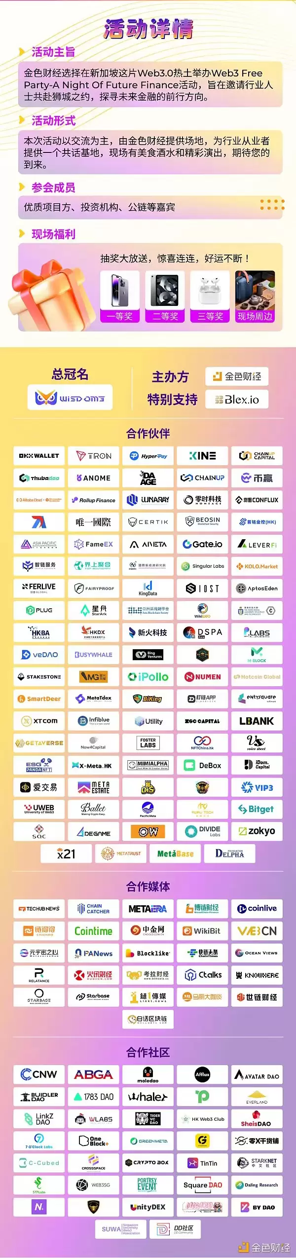 由金色财经主办、Wisdom3总冠名的Web3 Free Party-A Night of Future Finance即将于9月12日18:00在新加坡盛大举办。届时,来自不同赛道的行业领袖将齐聚一堂,共话Web3.0发展前景,聚焦行业前沿商机。