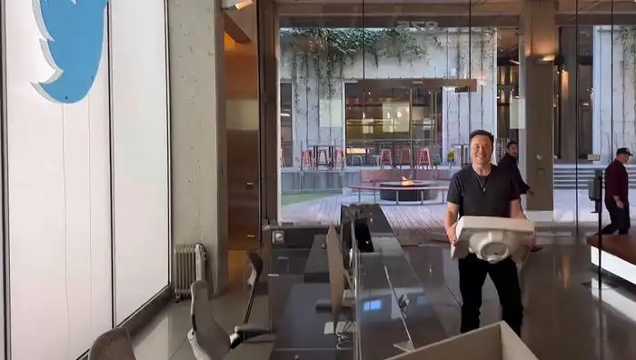2022 年 10 月 26 日,就在他收购该公司的交易即将结束前不久,马斯克开玩笑地拿着一个水槽走进 Twitter 总部。照片来源:马斯克个人 Twitter 账户