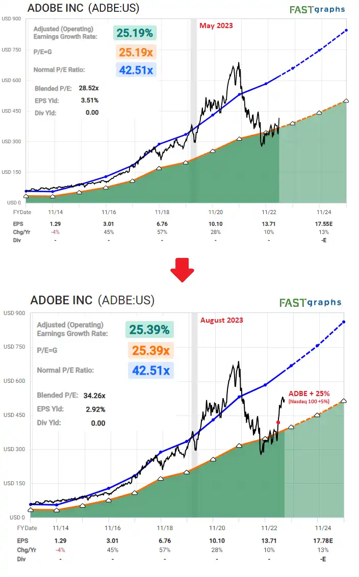 我最初在 5 月 28 日的高级报告中提到过这一观点,当时 Adobe 的股价尚未大涨,而 Nvidia(NVDA)的股价已经飙升,因此我认为从风险/回报的角度来看,Adobe 是在人工智能趋势中更可取的投资。截至目前,Adobe 的股价也已经飙升,速度远超纳斯达克 100 指数,因此我认为它不再处于一个很好的入场点,但我认为极度扩大的创作者易用性这一主题值得关注,我有意在 Adobe 调整时加入。