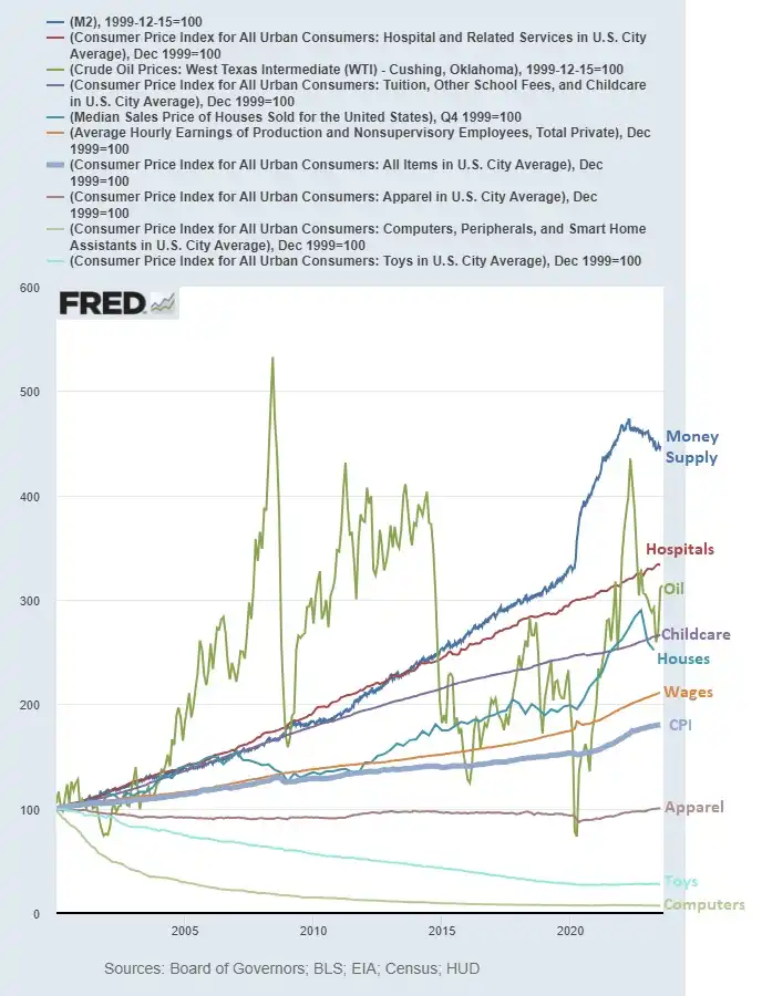 从 2000 年开始到 2022 年底,我们可以看到资产和消费品价格存在很大的分歧。黄金价格每年增长 8.3%,广义货币供应量平均每年增长 6.8%,医院服务价格每年增长 5.3%,石油价格每年增长 4.7%,房价中位数每年增长 4.7%,育儿价格每年增长 4.2%,非主管生产工人平均每小时工资收入每年上涨 3.2%,官方消费者价格通胀每年平均为 2.6%,银行账户平均年利率不足 2%,服装价格没有变化,电子产品、塑料玩具和各种软件的价格都有所下降。