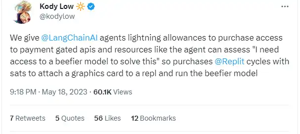 闪电实验室首席技术官奥拉奥卢瓦·奥松托昆在一个视频中提到,用户(Kody Low,Fedi 的开发者和产品支持主管)让 GPT-4 为他编写代码,并通过闪电网络按问题付费(大约每个问题 0.01 美元)。他要求 AI 编写的代码恰好是他已经展示的可用服务:使用闪电支付 API 调用的能力。