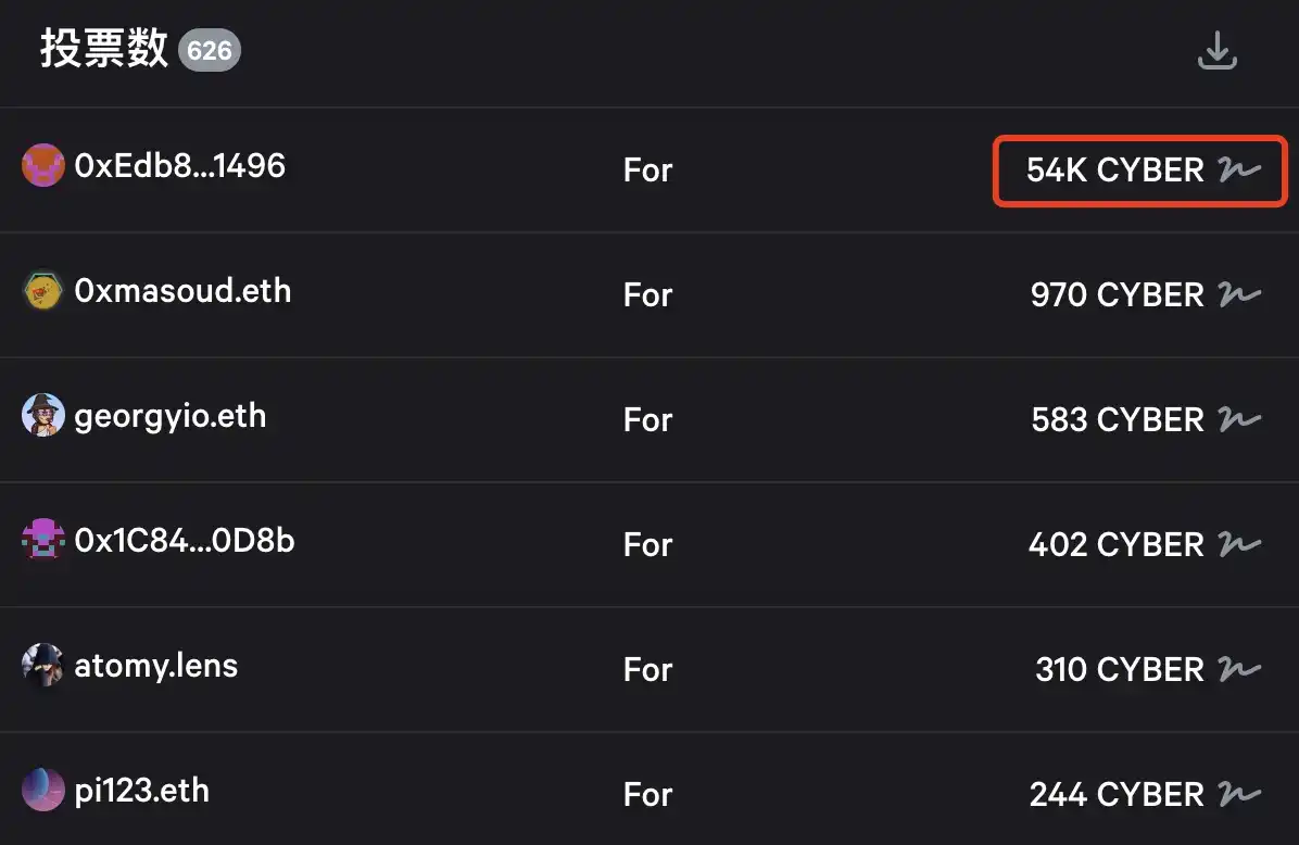 一个名为「cybergov.eth」(cyber 治理)的用户,发起了一场有效期仅 12 小时的投票。仅一名用户就投出了占总投票量 87% 的表决票。