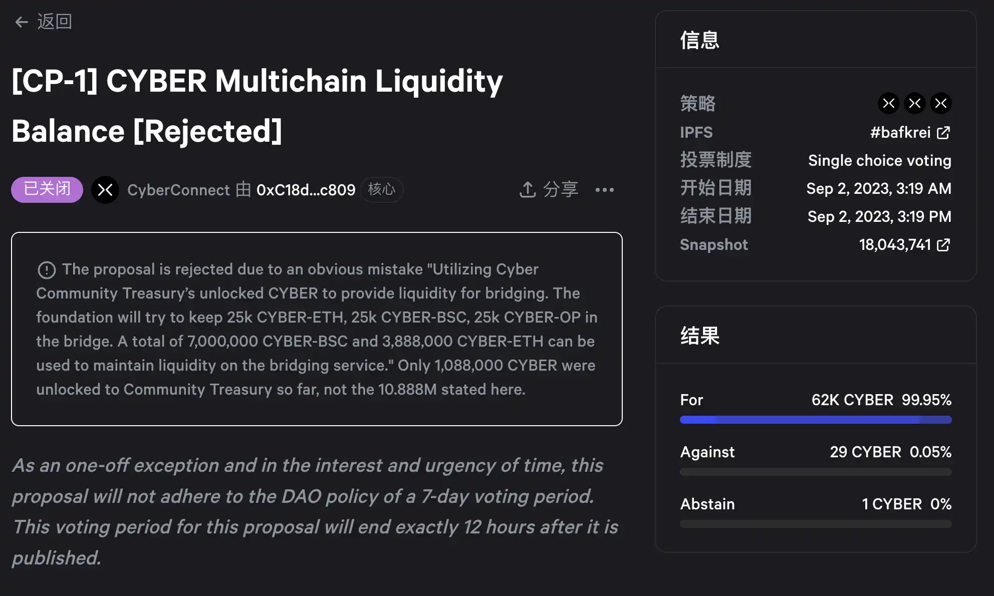 随后,CyberConnect 发布公开声明表示,在提案中所写的 CYBER 解锁数量方面系出现了错误。该提案已被宣布无效。同时宣布将推出新的提案已解决此前提到的流动性不足问题。