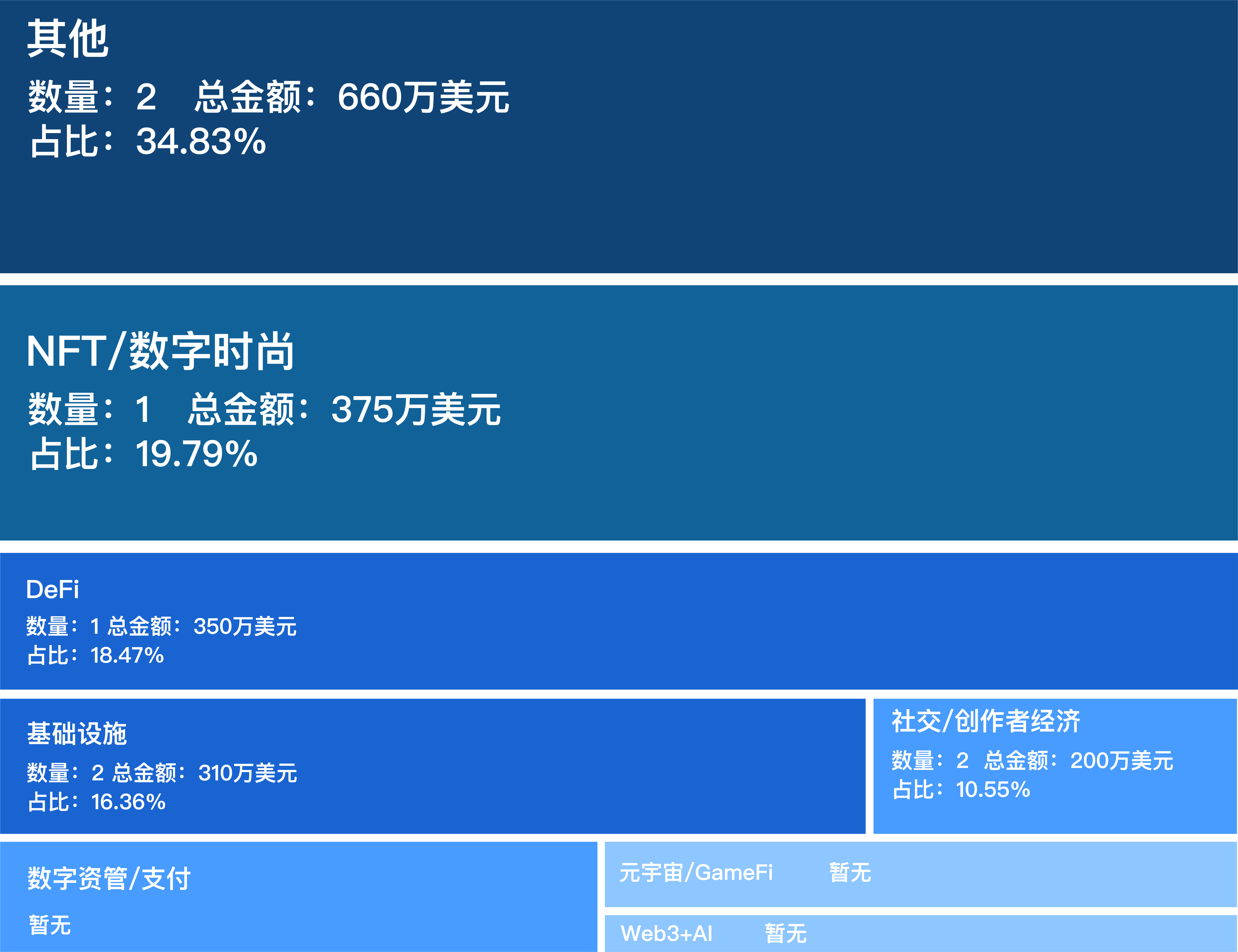 据 统计,上周的融资总数为 8 笔,数量较之前大幅降低,总金额约为 1895 万美元,平均融资金额为 236.88 万美元。其中,其他领域融资占据主体,NFT/数字时尚领域相对较多,DeFi 领域增多,基础设施领域和社交/创作者经济领域较少,数字资管/支付领域和元宇宙/GameFi 领域暂无。下图为上周各板块融资占比: