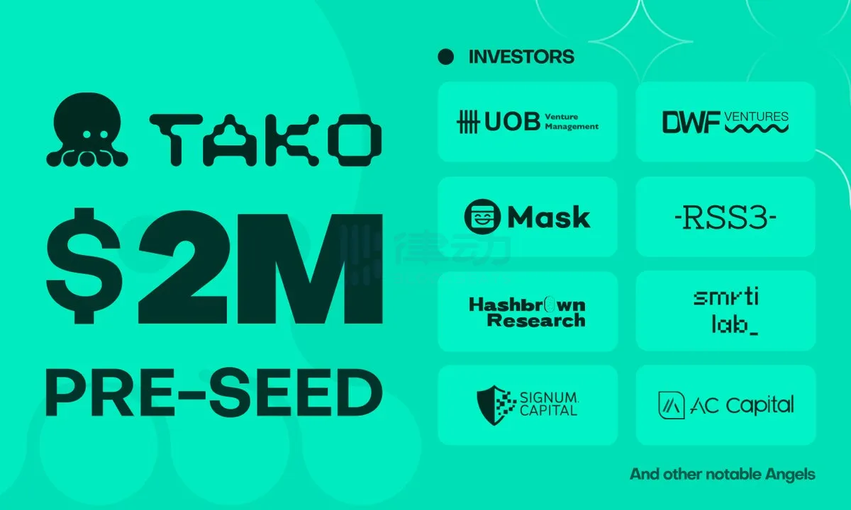 9 月 1 日,Web3 社交协议 Tako Protocol 完成 200 万美元 Pre-Seed 轮融资,本轮融资由 UOB Venture、DWF Labs 旗下 DWF Ventures、Mask Network、Signum Capital、AC Capital、SmrtiLab、HashBrown Research、RSS3 和一些天使投资者参投。