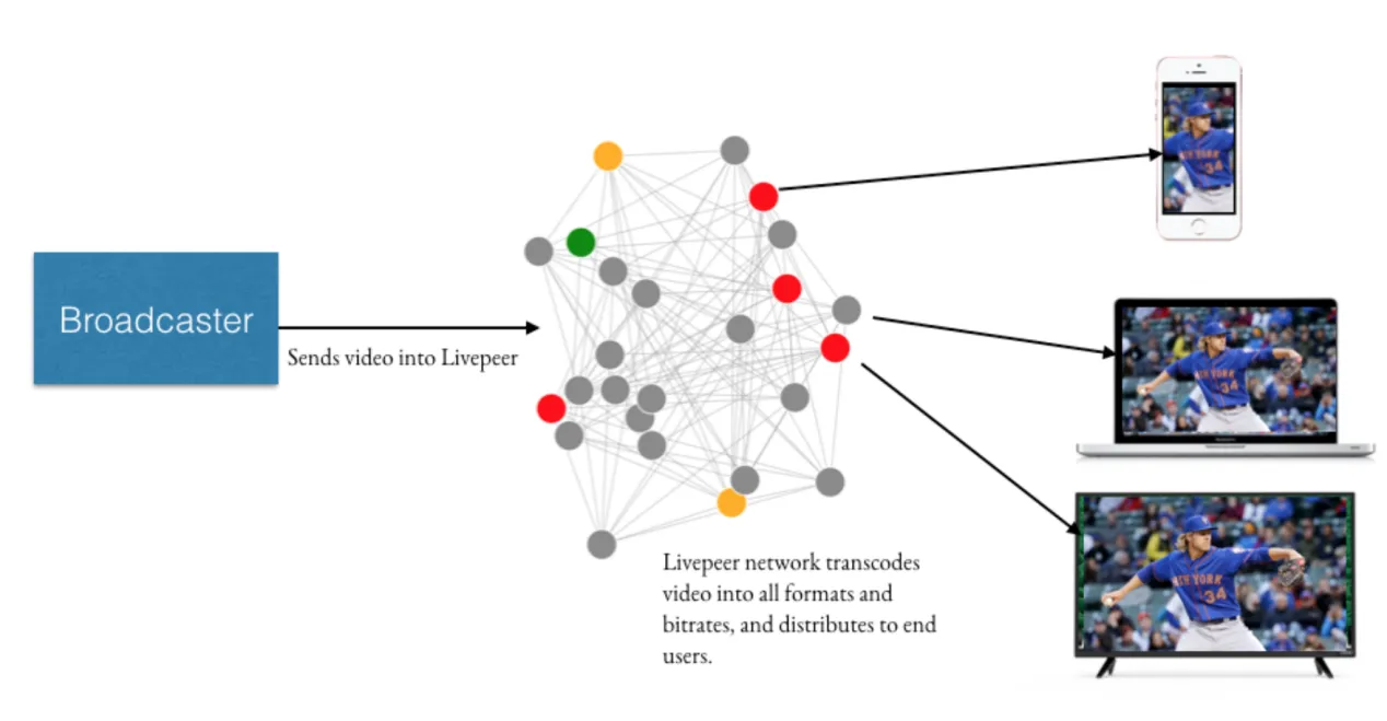 Alice 是一位应用程序开发人员,她正在使用 Livepeer 将实时视频功能添加到其所在高中体育赛事直播 app 中。Bob 作为赛事协调员负责使用 Alice 的应用直播他高中的篮球比赛。当 Bob 打开应用程序并开始录像时,该应用程序会将实时视频以及直播费用发送到 Livepeer 网络中,同时 Livepeer 将视频转码为观众可以接收的形式。