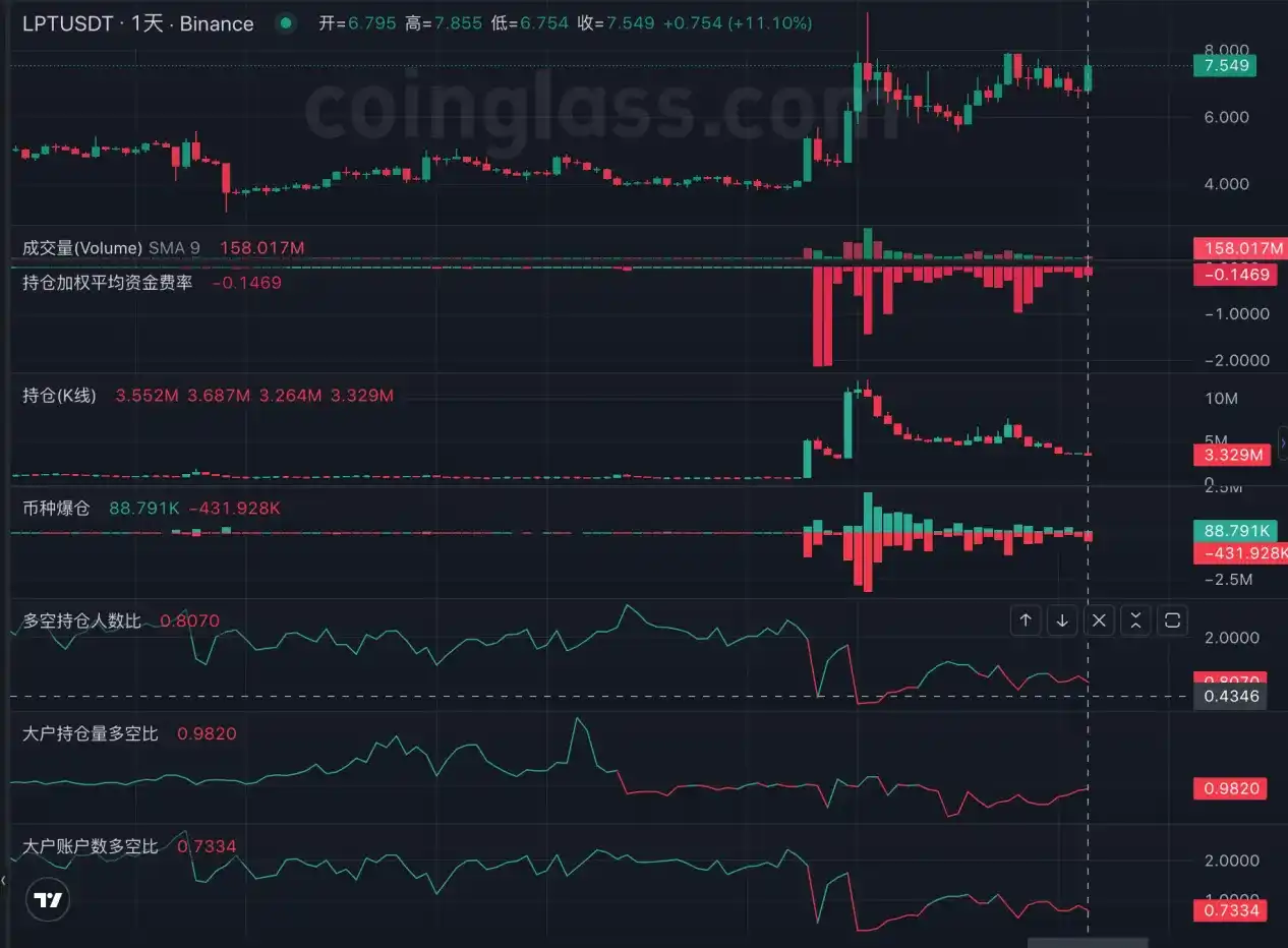 最近一波行情始于今年的 8 月 7 日,LPT 从 4.98 到 5.87 单日上涨 43%,8 月 13 日最高上涨到 9.26,实现一周翻倍。今日上午 9:30 15 分钟拉涨 12%,现在前高的位置附近暂未突破。虽然价格尝试再次冲击 8 美元关口,但 LPT 合约持仓量处于这一波行情启动以来的相对低位,且并未伴随价格上涨出现持仓量的明显上升。目前资金费率跌至-1% 以下,多空持仓人数比和大账户多空比分别下跌至 0.81 和 0.72。
