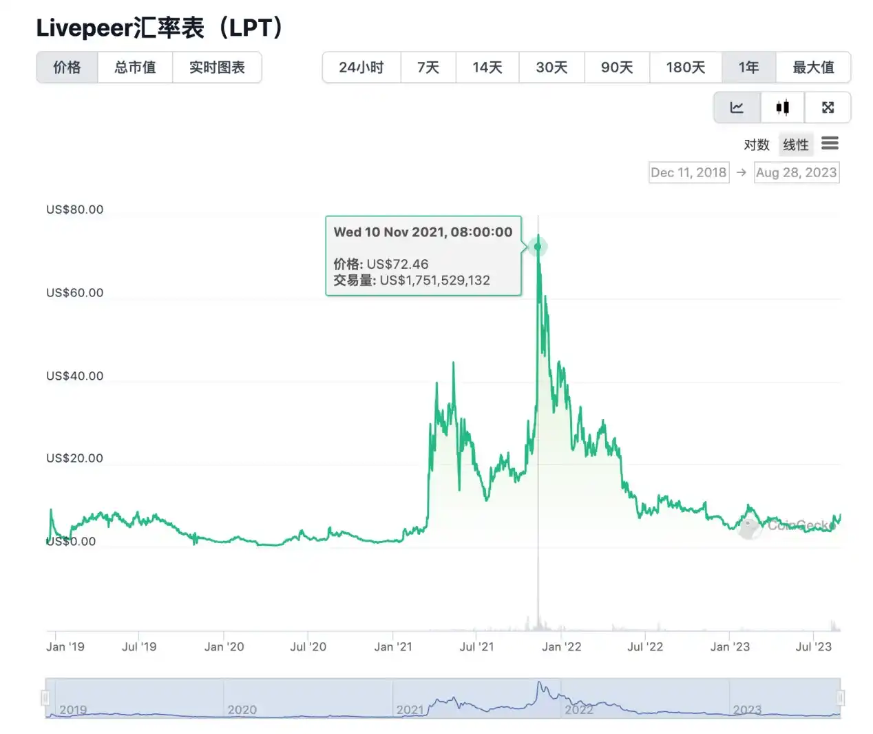 LPT 于 2018 年上线,最高价出现在 2021 年 11 月,当前价格距离最高价下跌 92.3%。