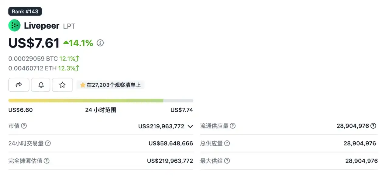 LPT 代币处于全流通的状态,市值 2.19 亿美元,排名第 143 位。