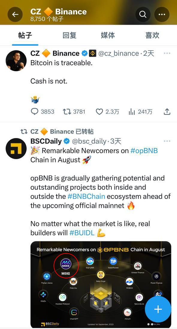 上周五专注于介绍 BSC 链上特色项目的推特账号 BSCDaily,发布了一张 8 月 opBNB 生态中的新成员图,Binance 创始人 CZ 第一时间转发的这条消息。作为下一步战略布局,opBNB 不仅会带 Binance 走向新的发展阶段,同时这张图中展示的项目,都是有可能像曾经的 BTT 一样,为 Binance 带来震破熊市的火爆反响。