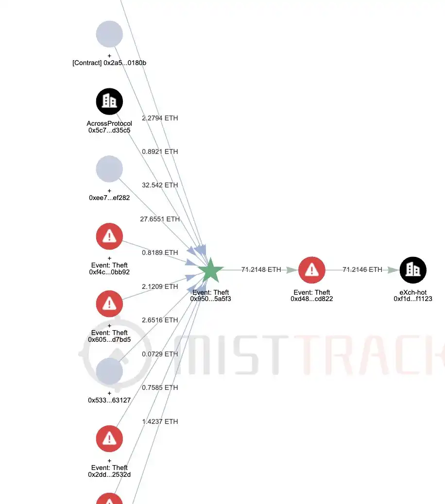 据 MistTrack 监测,今日 9 时左右,比特浏览器黑客将多个地址的资金转至 0x950a 开头地址。此后 0x950a 开头地址将 71.21 枚 ETH 转至 0xd488 开头地址,然后转入 eXch。 截至目前,已有 307.48 枚 ETH(约合 502,403 美元)被转移到 eXch 平台,占比特浏览器被盗资金的 87%。
