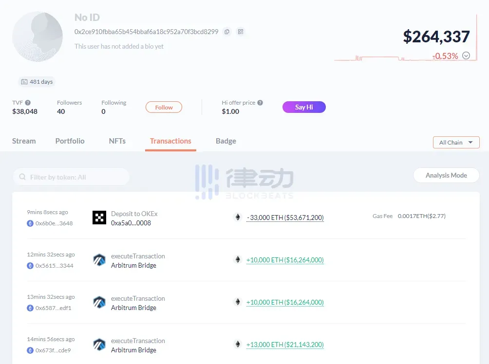 巨鲸地址从 Arbitrum Bridge 提币 3.3 万枚 ETH 转入 OKX
