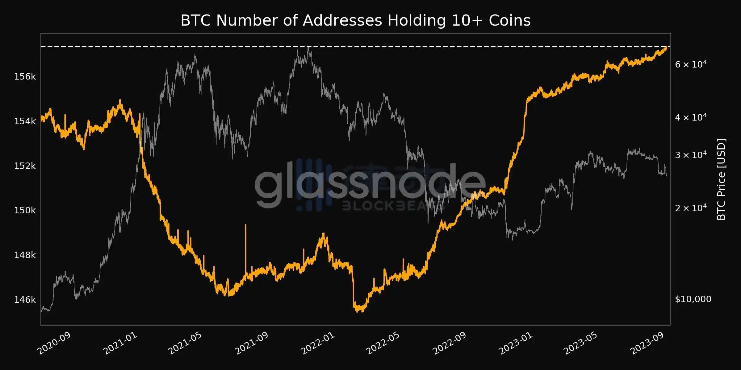 数据:持有 10 枚及以上数量 BTC 的地址增至约 15.7 万个,续创近 3 年以来新高
