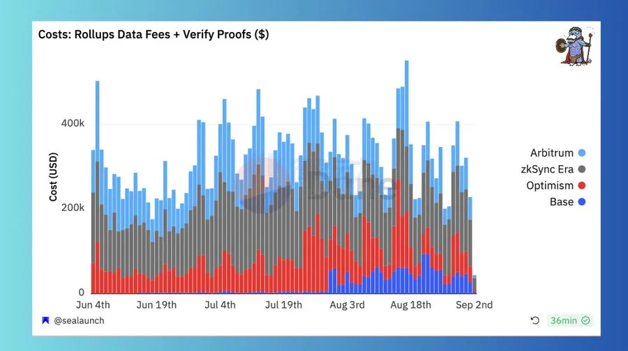 在短短 3 个月内,zksync 支付了超过 1300 万美元的数据可用性(DA)和验证成本,其次是支付了 830 万美元的 Arbitrum,以及支付了 650 万美元的 Optimism。但这些成本的来源是什么?导致这些成本的三个主要因素包括: