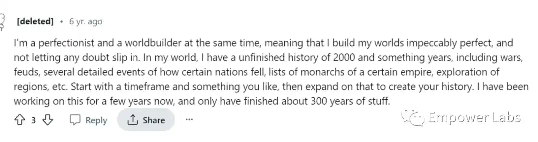 截图翻译:我是一个完美主义者,同时也是一个世界构建者,这意味着我将我的世界打造得无可挑剔,不让任何怀疑溜进去。在我的世界里,我有 2000 年未完成的历史,包括战争、世仇、一些关于某些国家如何衰落的详细事件、某个帝国的君主名单、地区探索等。从一个时间框架和你喜欢的东西开始,然后扩展它来创造你的历史。我在这方面已经搞了几年,但只完成了大约 300 年的历史。