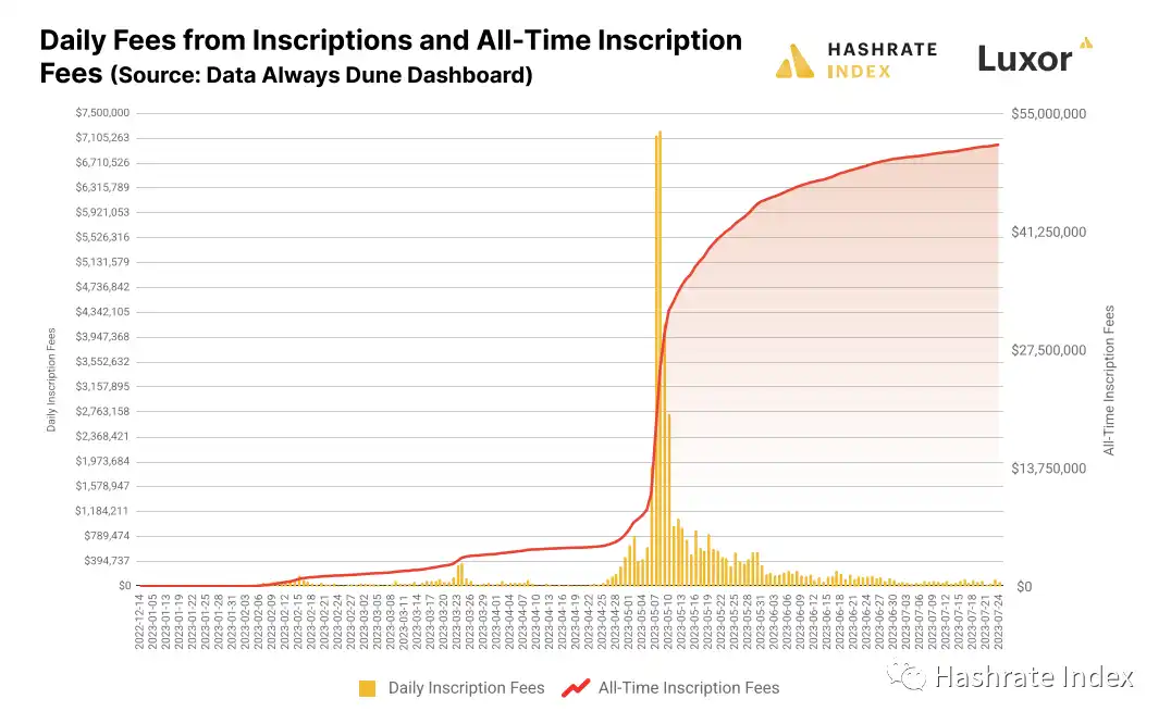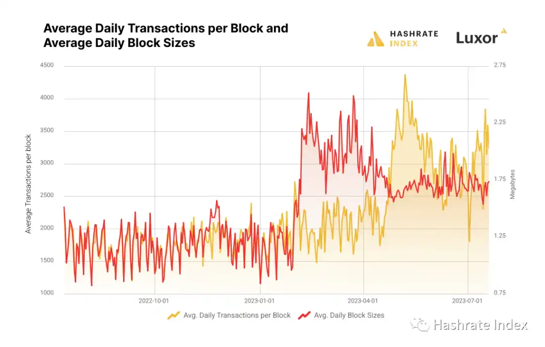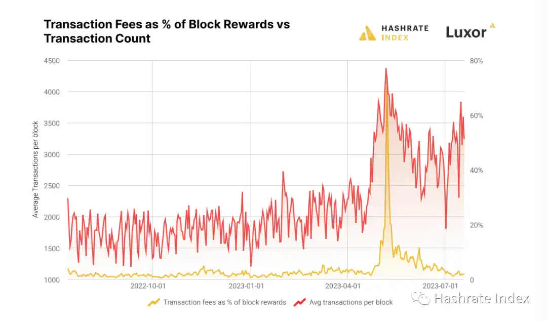 2 月份是对序数铭文的接纳立即使矿工从交易费用中获得了双倍于 2022 年的收入。2022 年时,区块奖励从交易费用中获得的平均份额为 1.63%;而截至目前为止,Q1 的平均份额为 2.3%,Q2 的平均份额为 8.11%,全年的平均份额为 4.9%。