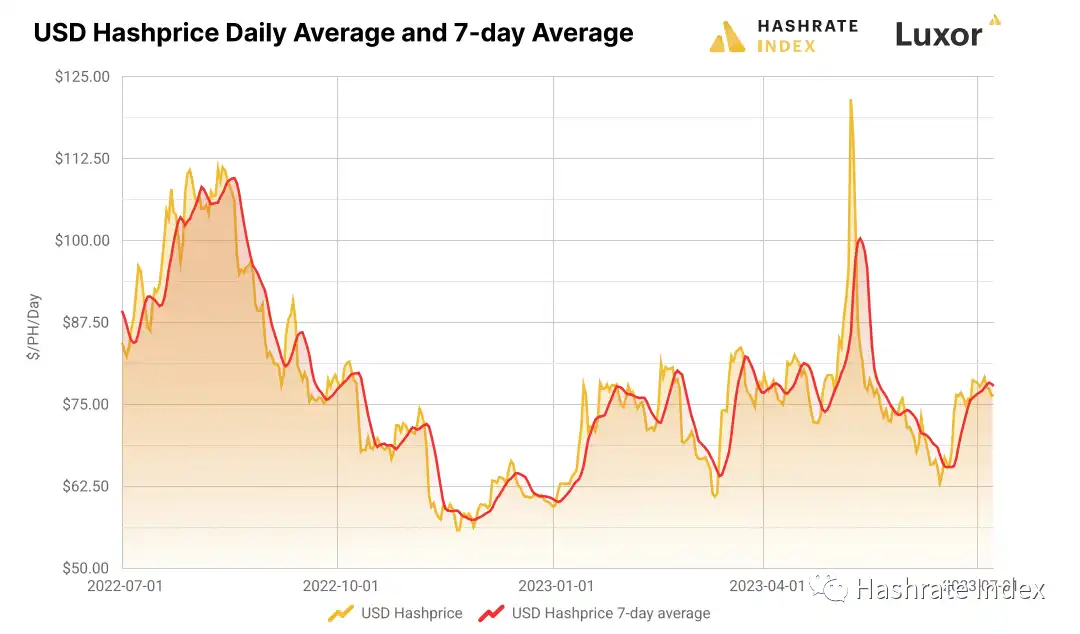回想一下我们在 2022 年年末报告中提到的(如果您是矿工,就不需要提醒了),去年第四季度算力价格跌至谷底。它在第一季度有所反转,为矿工提供了一些救济,在第二季度,算力价格在 NFT 潮衰退(我们在序数/铭文部分将进一步探讨)、比特币价格复苏和缓慢的算力增长的组合下快速反弹并稳定下来。