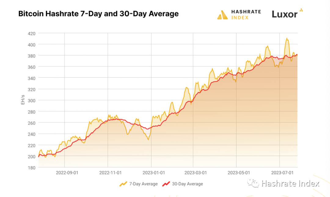 目前来看,比特币的算力在 2023 年已大幅增长。截至 2023 年 7 月 22 日,比特币的算力与年初相比增长了 50%,从 255 EH/s 增至 380 EH/s。