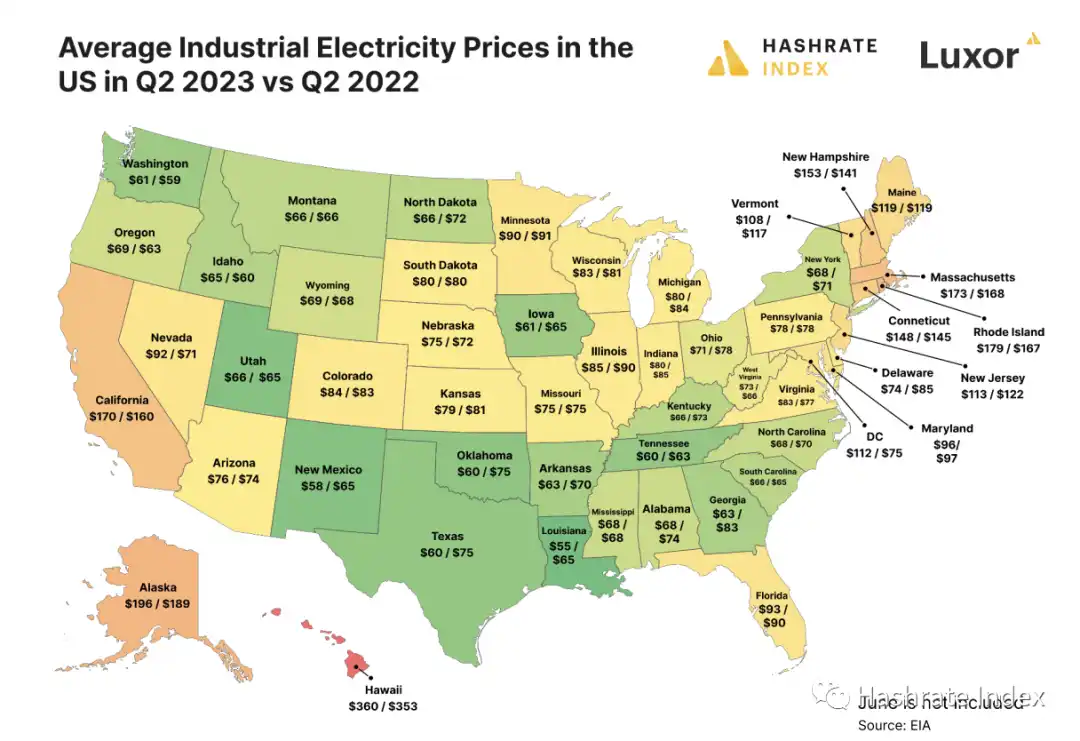 由此可见,北美算力的高集中度(45-50%)对比特币算力形成了新的季节性影响:夏季的热浪让美国各地的电网过载,迫使矿工减少挖掘规模,从而抑制了算力的增长。具体而言,比特币七日平均算力在 2023 年第二季度增长了 7.5%,远不及第一季度 35% 的增幅。这种缓慢的增长主要是由于夏季温度干扰了美国等挖矿热点地区的运营。尽管值得注意的是,与去年的夏季记录热浪相比,今年夏季的算力增长并没有受到太大影响。