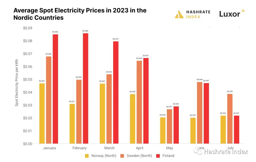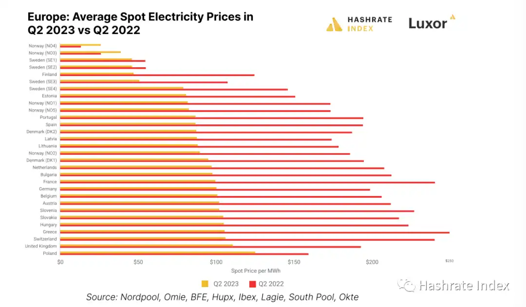 北欧的比特币挖矿业的主要卖点是来自挪威和瑞典北部的丰富水力发电所提供的稳定、低廉电价。那么 2023 年间这些地区电价又是怎么变化呢?