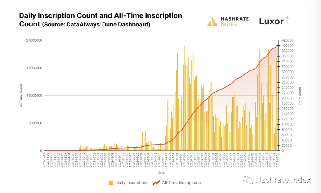 铭文在 2 月引起了加密圈的注意,并且早期采用者争相铭刻数字艺术和杂项收藏品。这种新颖的 NFT 方法吸引了来自以太坊生态系统的许多 NFT 交易者、收藏家和创作者,这一迁移加速了疯狂和交易费用的蓬勃发展。截至目前为止,Bitcoin 的区块链上已经有超过 1960 万个铭文。
