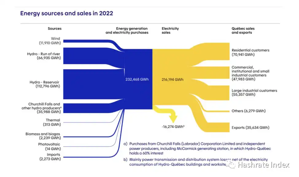 由于其丰富的水电能源,魁北克省成为早期的挖矿重镇。2022 年,它出口了其产出的 16.5% 电力。根据电力管理机构 2022 年的报告,在 2022 年,Hydro-Quebec 出售了 2162 亿千瓦时的电力,其中 356 亿千瓦时出口,主要出口到美国东北部的大城市,如纽约,平均价格为每千瓦时 0.082 美元。