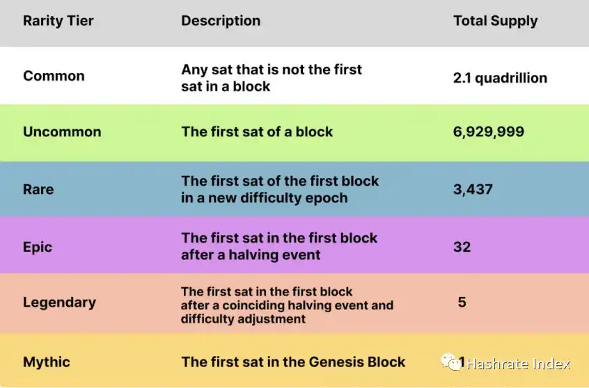 图五:比特币「聪」的稀有等级划分一览 Ordinal 及铭文使得交易费用创下历史新高