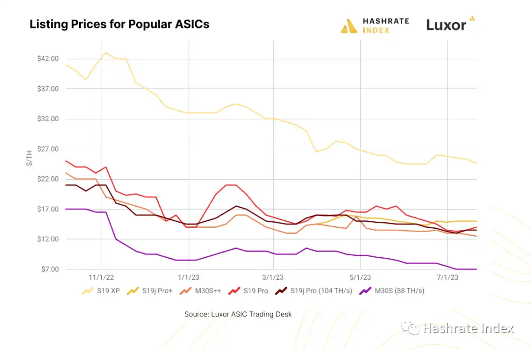 价格大体上仍然是呈下降趋势,但市场数据显示出 7 月份矿机价格或将趋于稳定的迹象,尤其是对于新一代设备。下面我们列出了一些热门矿机机型价格的季度变化情况(数据来自 Luxor 的矿机交易平台 RFQ)。