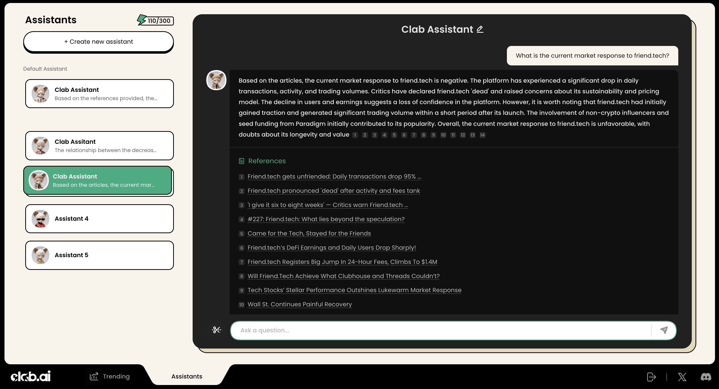 目前市场上基于 GPT4 模型的 AI 助理已经并不新鲜,普遍都能对一些基础概念进行解释或总结,但回答问题的时效性一直很难跟上行业变化。对于市场中出现的新产品,社交媒体上迅速传播的新项目,AI 助理的解释能力相当有限。如果想要面向 Web3 用户做一款真正能提供价值信息的 AI 助理,Clab 在数据库上就需要下更多功夫。目前 Clab 的数据库信息的更新在分钟级别,Twitter 的热搜榜也以小时为单位滚动更新。这保证了 Clab 的助理在信息储备上的即时性,对于用户对新事件的了解需求,都能基于新鲜的数据储备给出全面、准确的回答。