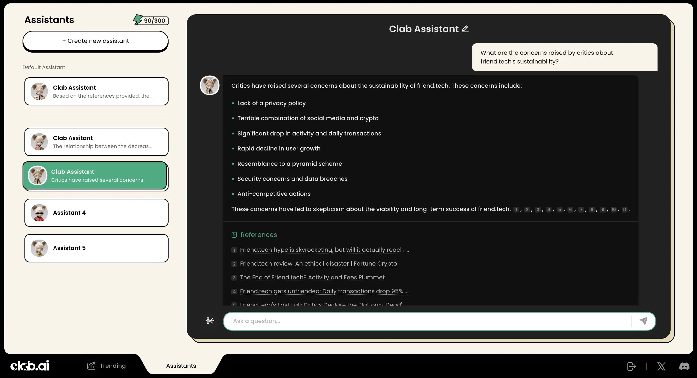 我们根据 Clab 的问题建议,对这个话题进行了继续追问:「批评者对 friend.tech 的可持续发展提出了哪些担忧?」