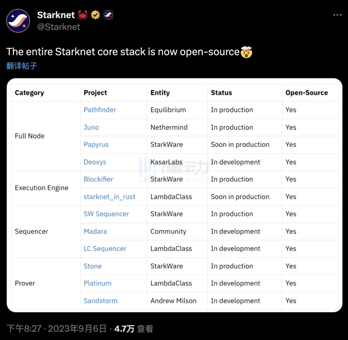 1. Starknet 全部核心堆栈现已开源;
