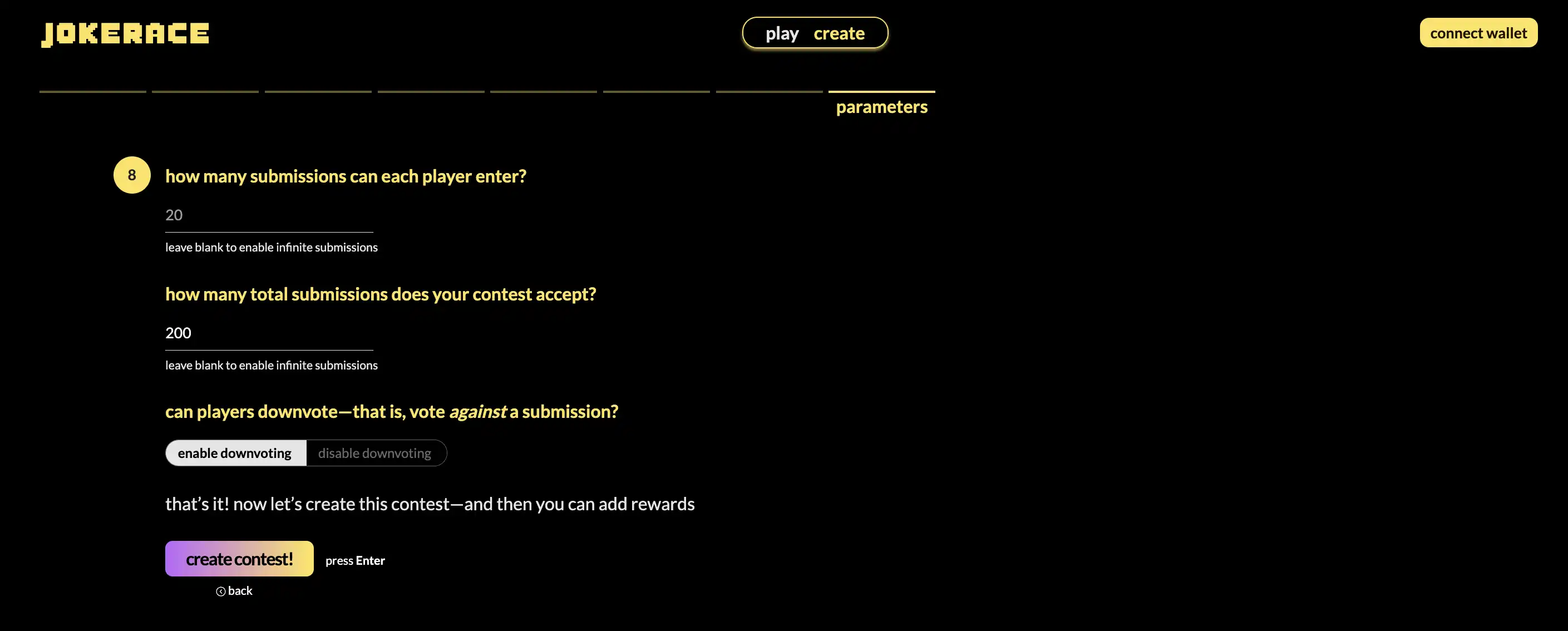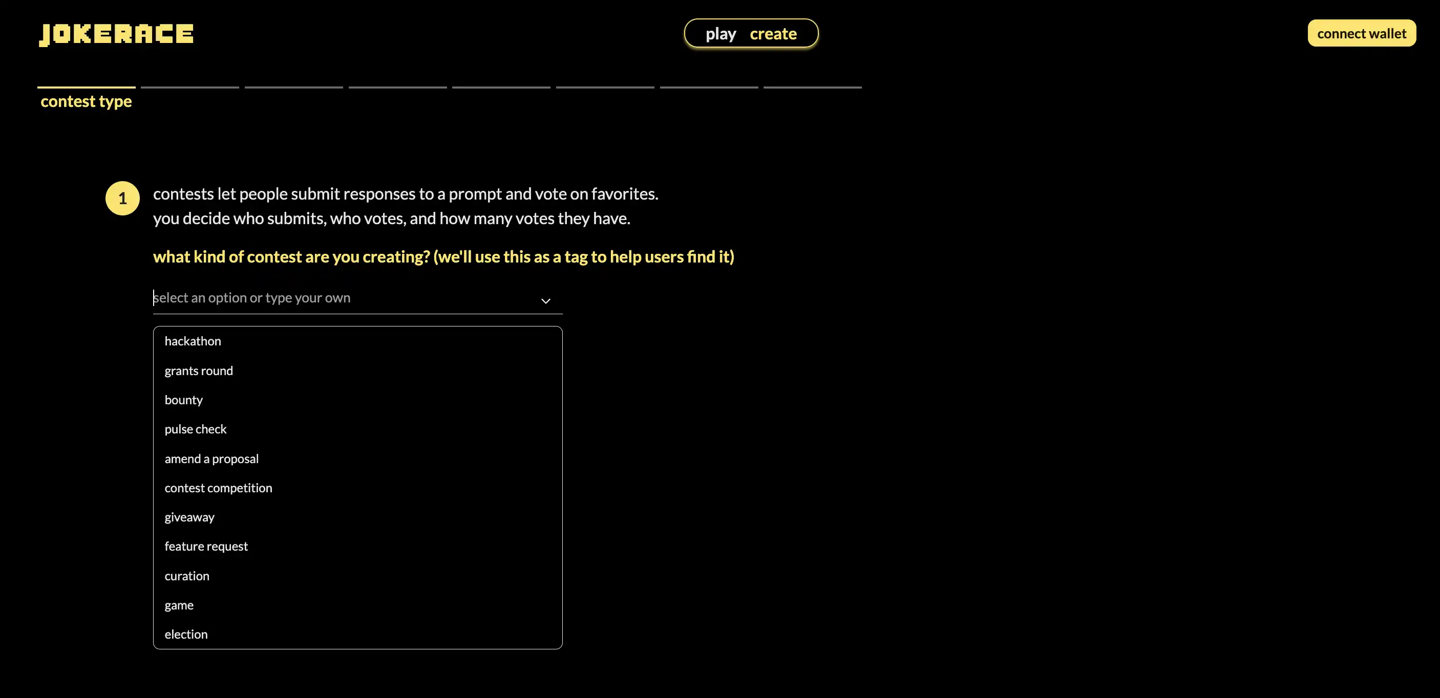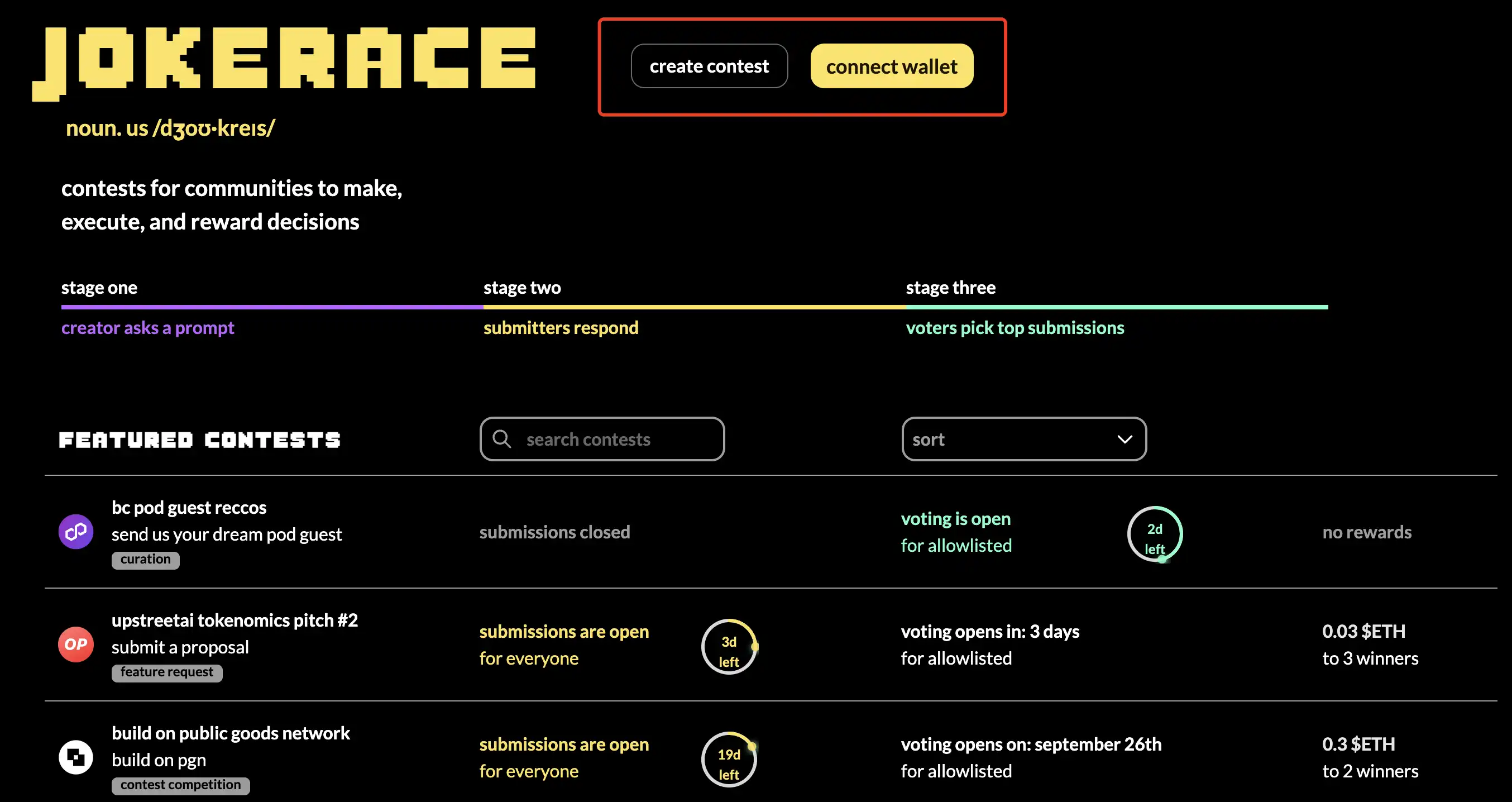 Jcokerace 的「竞赛」(contests)运作方式是,你在网站上创建一个 contests,发布一个问题,人们提交对你的问题的回答,然后其他人对他们最喜欢的回答进行投票,如果你愿意,还可以添加一个奖励池,获胜者可以从中获得奖励。谁有资格投票由发布问题的人自行决定,而最后发布问题的人也能获得一份用户数据列表。