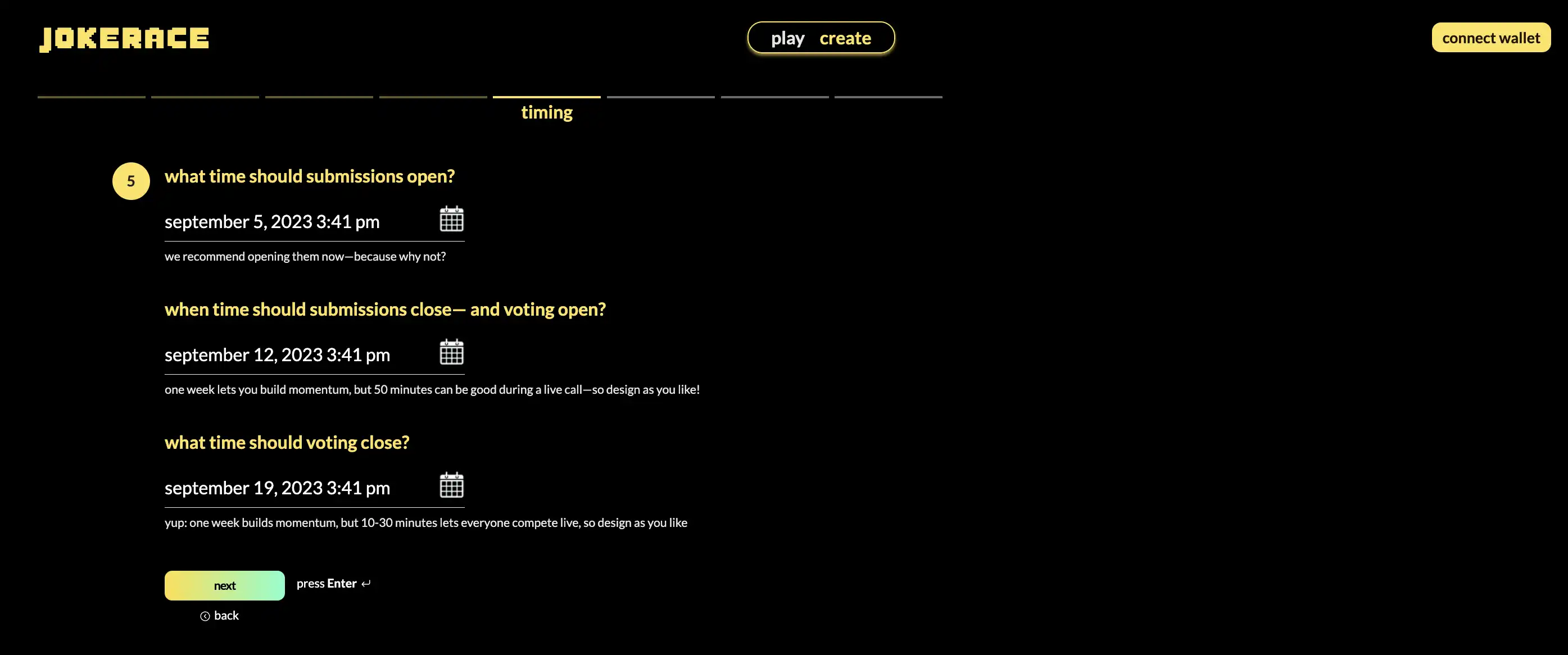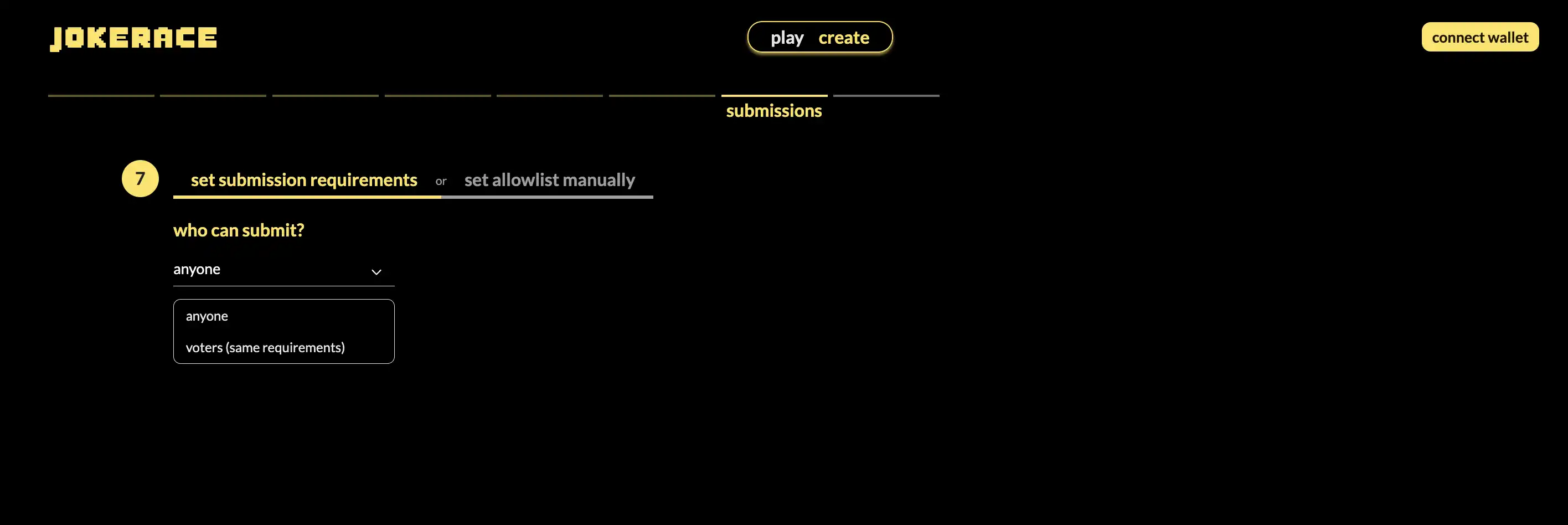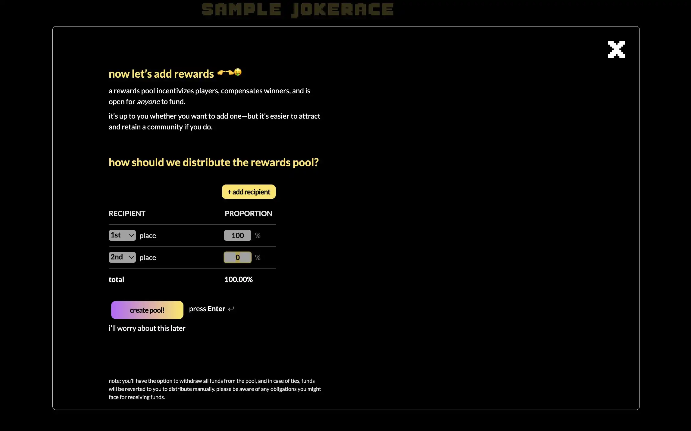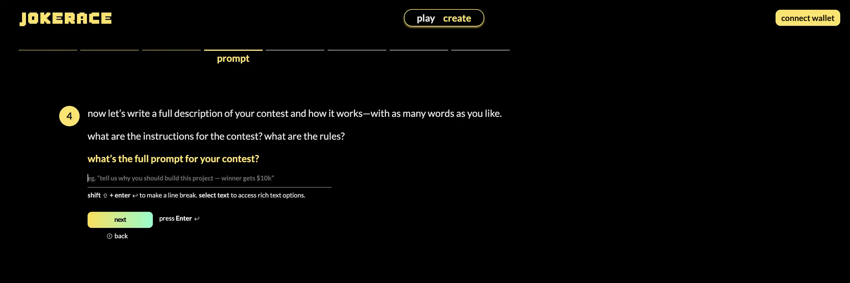 Jcokerace 的「竞赛」(contests)运作方式是,你在网站上创建一个 contests,发布一个问题,人们提交对你的问题的回答,然后其他人对他们最喜欢的回答进行投票,如果你愿意,还可以添加一个奖励池,获胜者可以从中获得奖励。谁有资格投票由发布问题的人自行决定,而最后发布问题的人也能获得一份用户数据列表。
