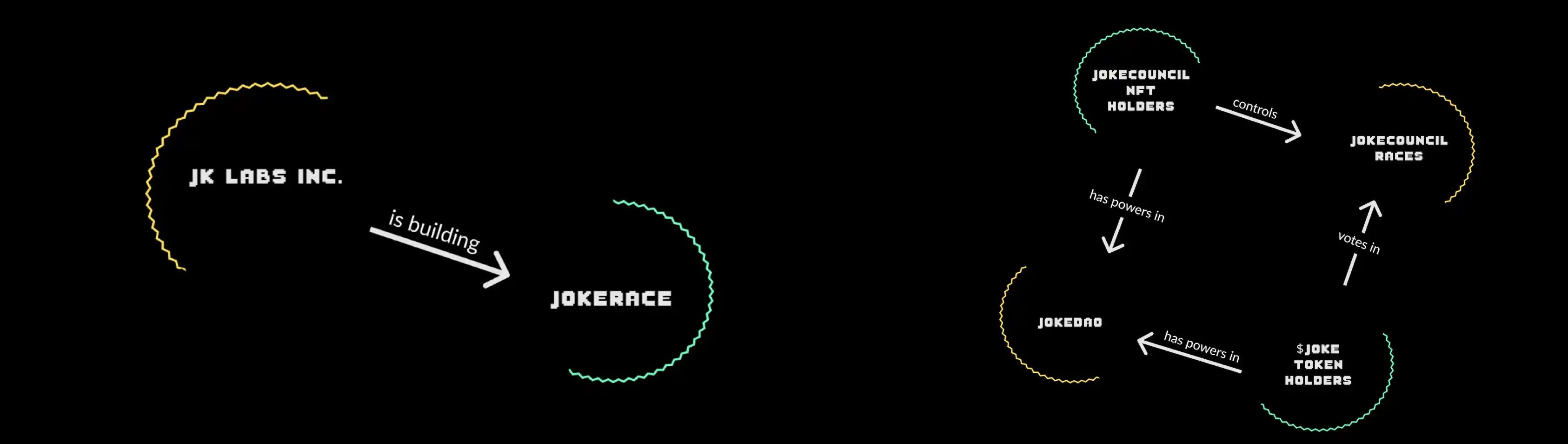 了解了 Jokerace 在做什么事情之后,我们来聊聊 Jokerace 背后的 JK Labs 以及和名称它很像的 Jokedao。简单概括就是 Jokerace 是 JK Labs 构建的竞赛平台,是品牌「Jokerace」的一部分,该品牌目前包含 Jokerace 以及一个独立 NFT 社区——笑话委员会(the jokecouncil),其诞生于每周一次的笑话竞赛,Jokedao 是这个社区的名称,有自己的多重签名来管理其代币 $JOKE。