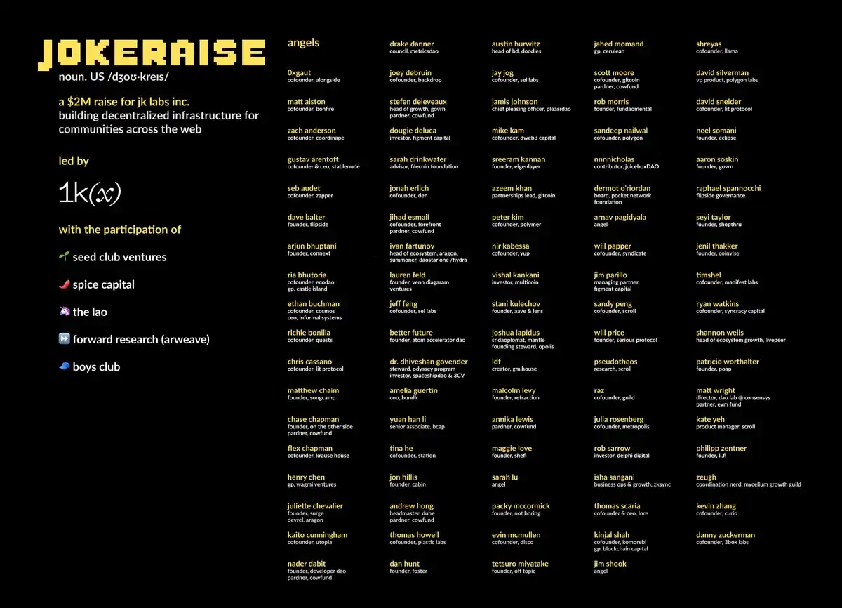 8 月 15 日,链上治理平台 Jcokerace 完成了 200 万美元的 pre-seed 轮融资,参投方包括 1kx、Boys Club、Seed Club Ventures 和九十多名天使投资者,被称作加密史上「天使投资人」最多的项目。值得一提的是,作为一个应用型的项目,Jcokerace 的投资方大都是这个平台的用户。